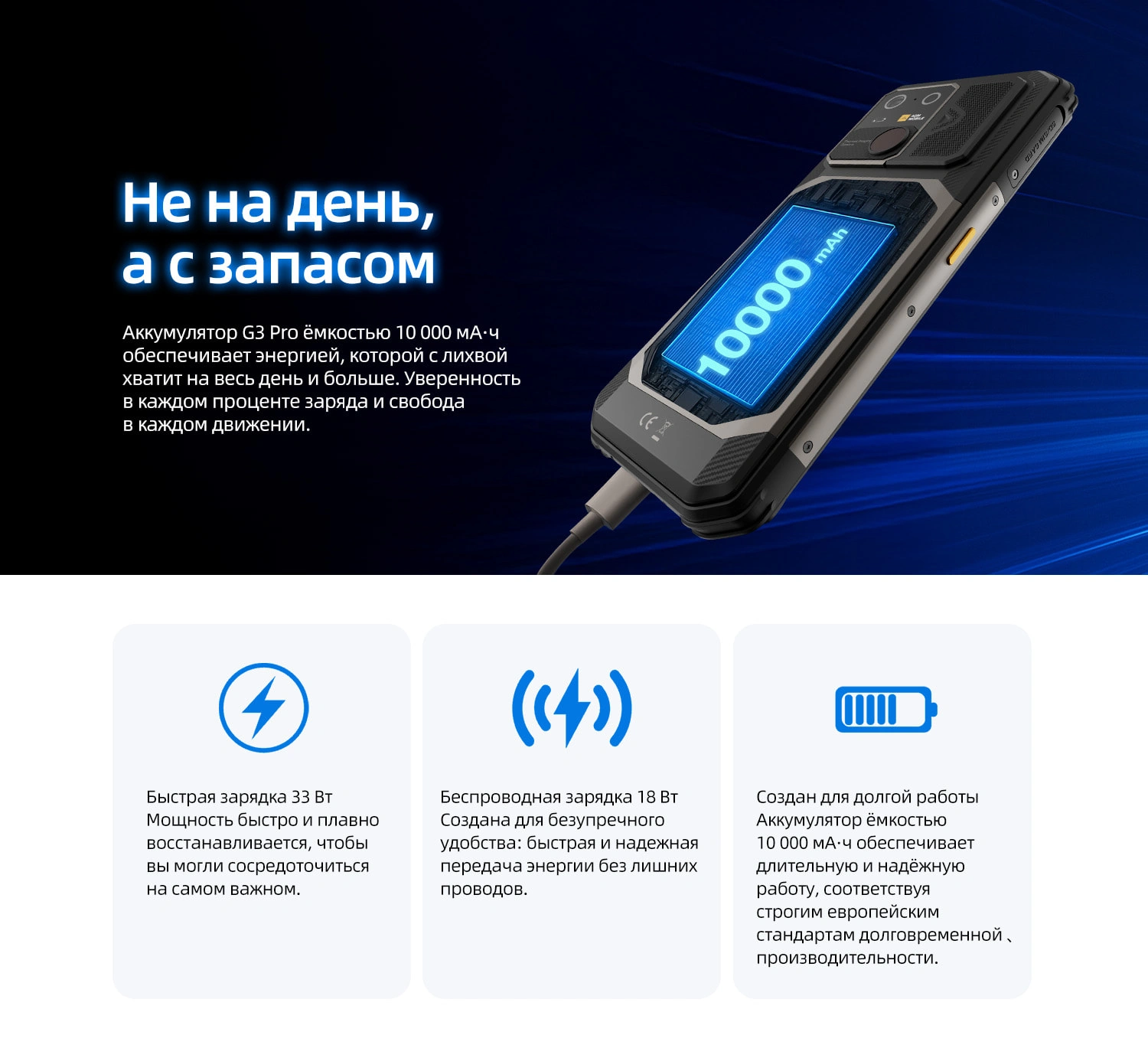 Батарея 10000 мА·ч — автономная работа на несколько дней