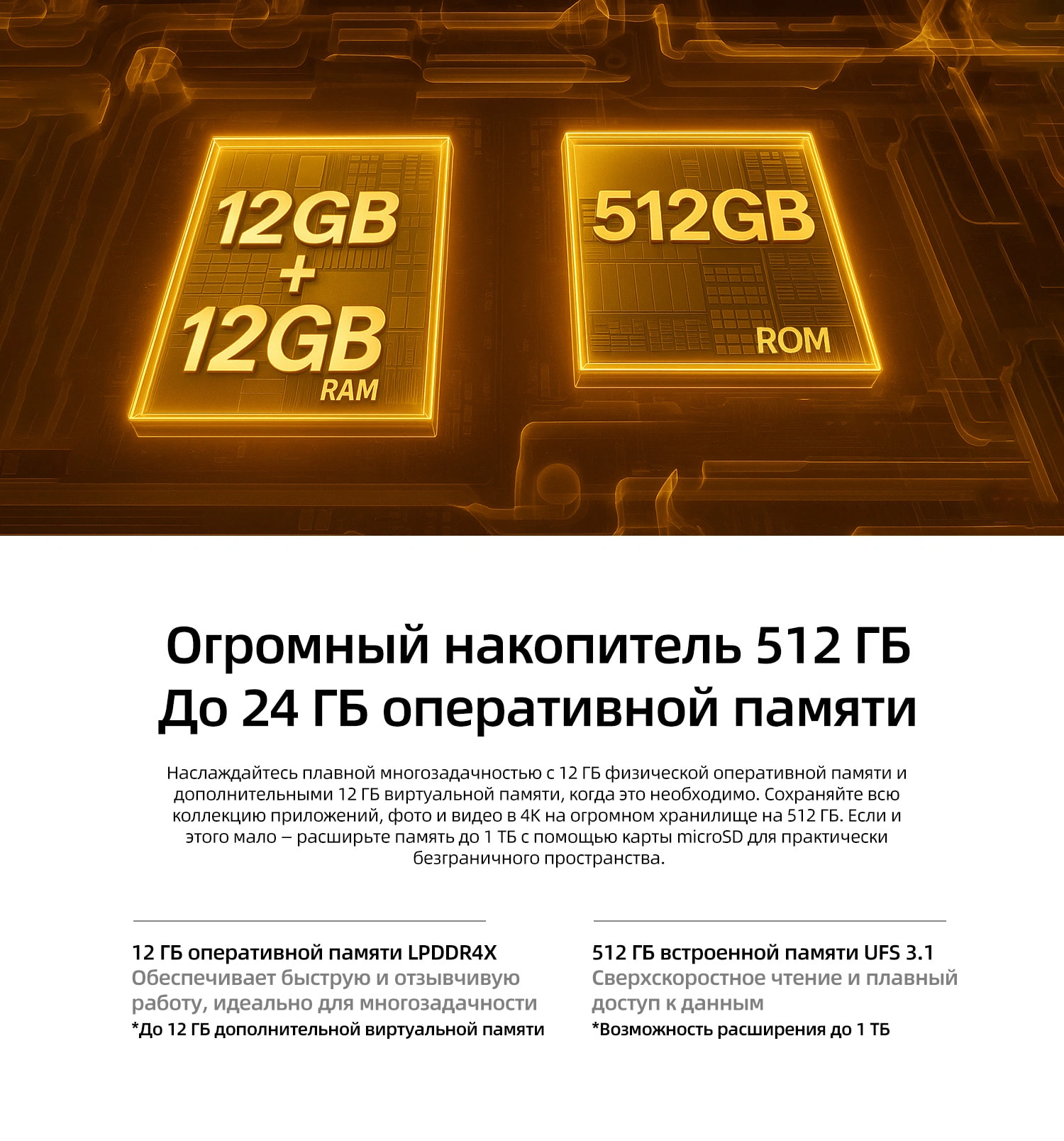 Огромный объем памяти 12ГБ+512ГБ — топовые характеристики производительности и достаточное пространство
